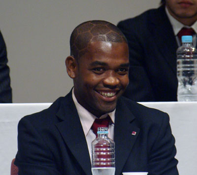 緊張気味の我那覇和樹選手です。なんだか出席選手の中で一番緊張していたような・・・